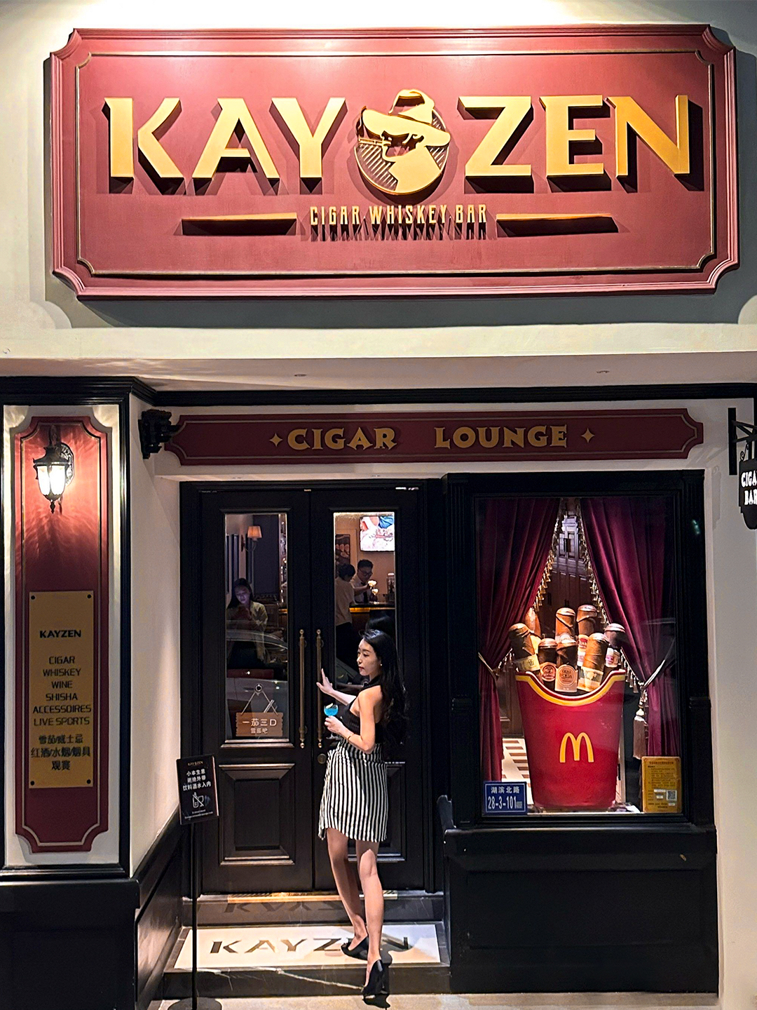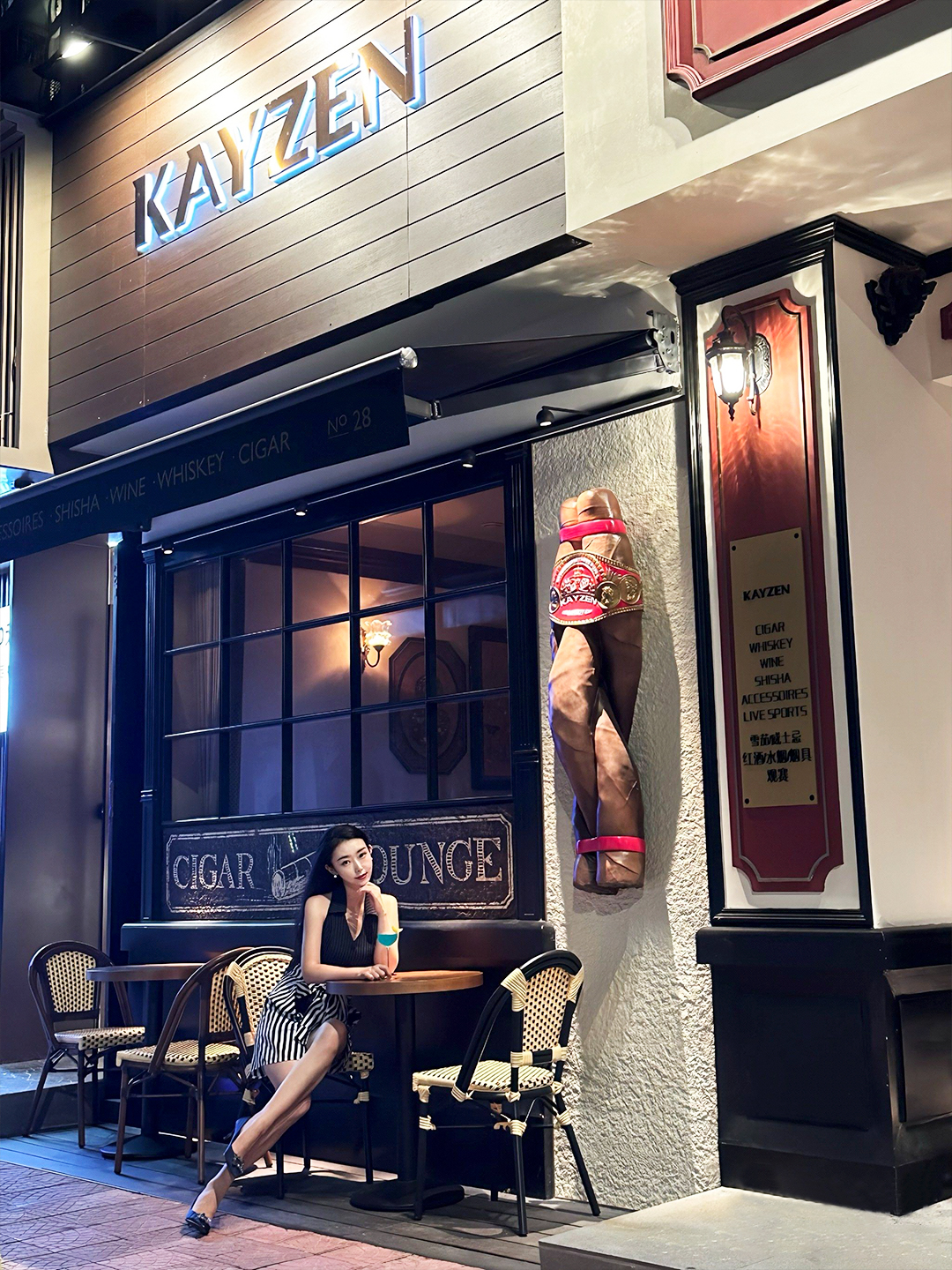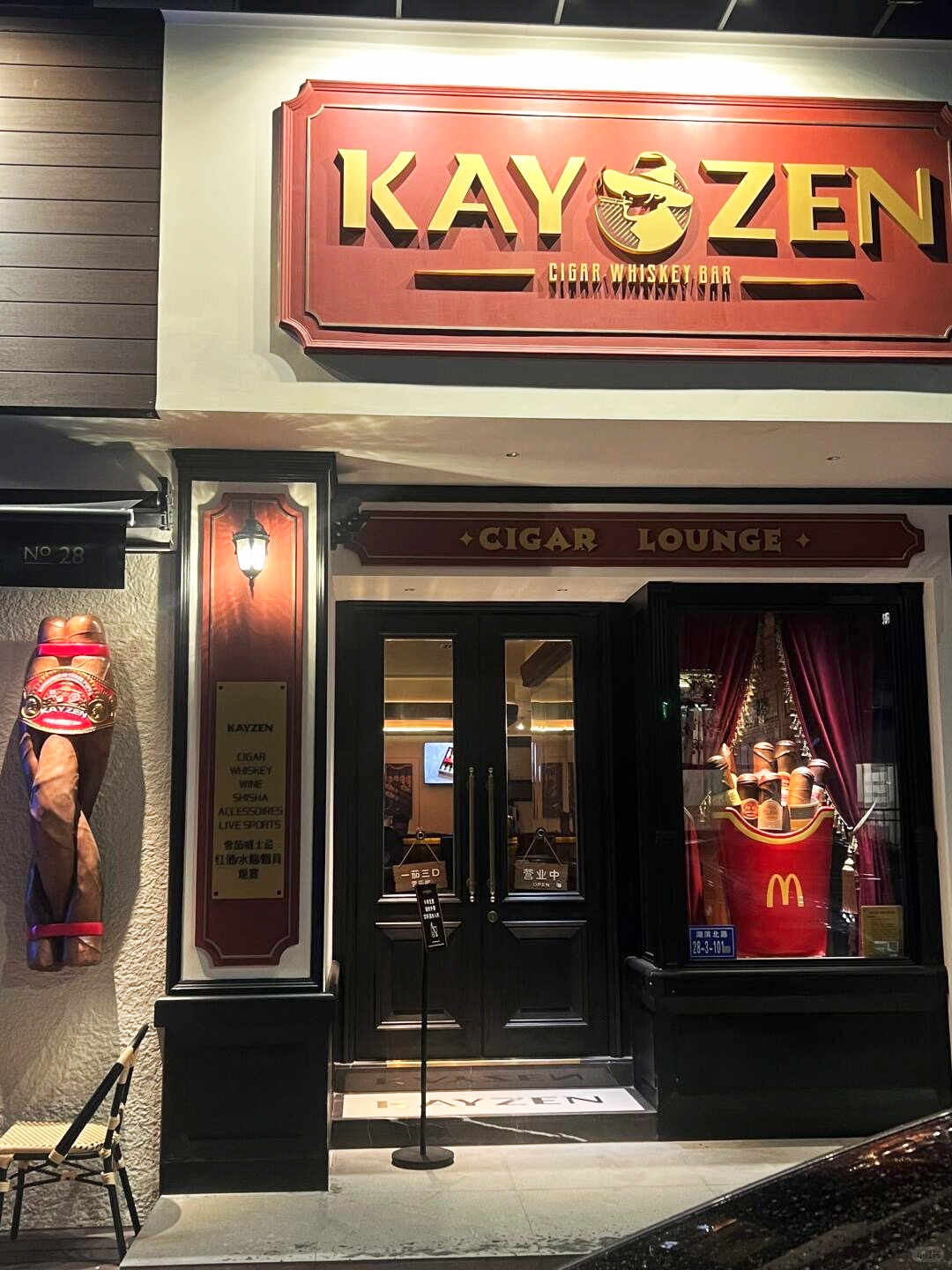 就像为示例中的KAYZEN打造的复古门头,既还原了雪茄威士忌吧的绅士格调,又在结构与视觉上实现商业场景的专业适配——我们用专业,让你的店招不止是招牌,更是品牌专业度的‘门面担当’,在街景中成为客户一眼信赖的‘视觉契约’。