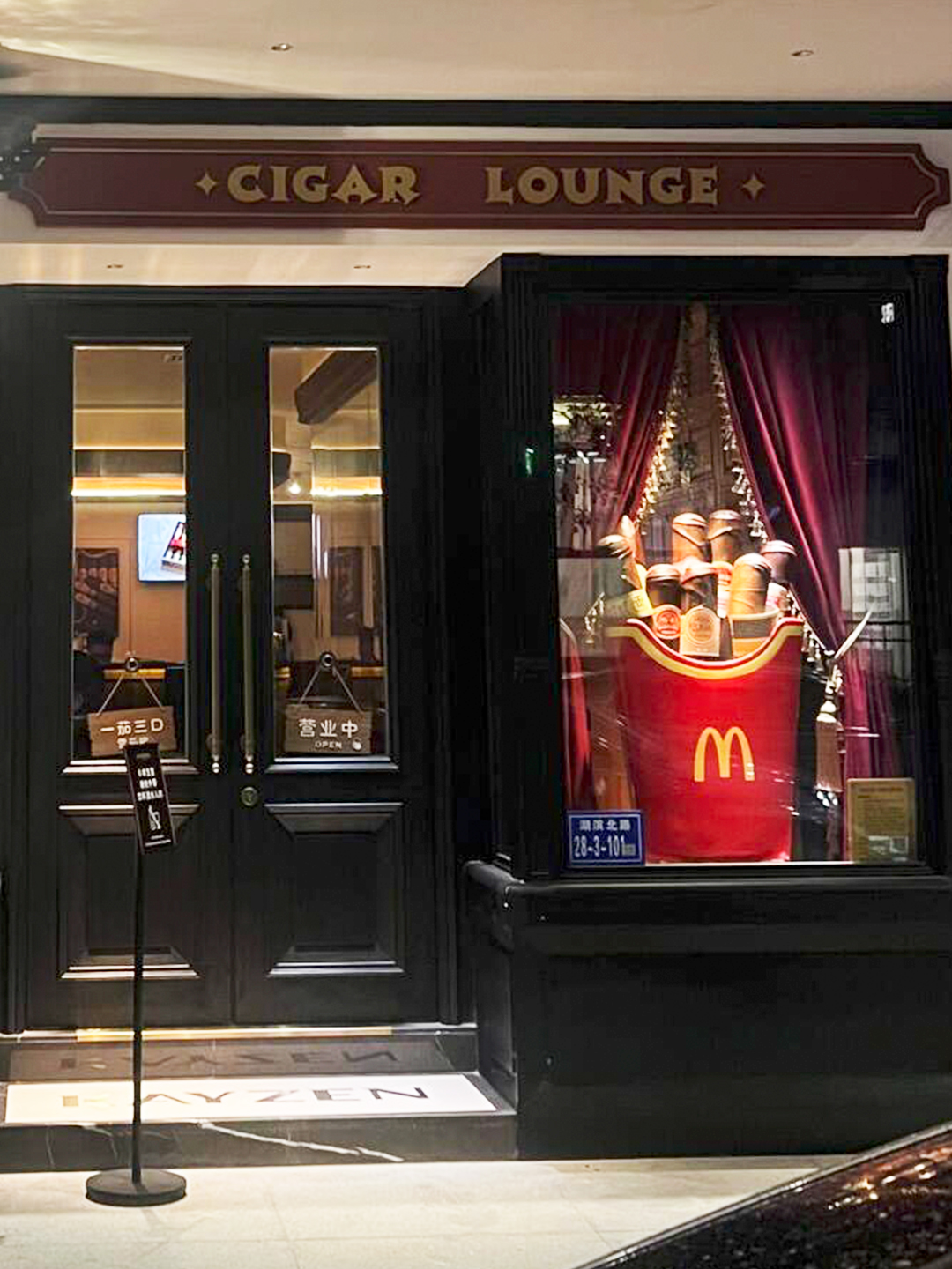 当雪茄遇上薯条桶,一场创意营销的风暴就此开启!这款玻璃钢雕塑以经典麦当劳薯条桶为原型,大胆采用红金高饱和配色,桶身光泽感十足,视觉冲击力拉满;内部插满的“雪茄薯条”,每一支都经过精湛工艺雕琢,雪茄的肌理褶皱、醇厚色泽精准还原,更可根据您的需求定制专属品牌环标,让每一处细节都彰显门店的独特格调与专业底蕴。